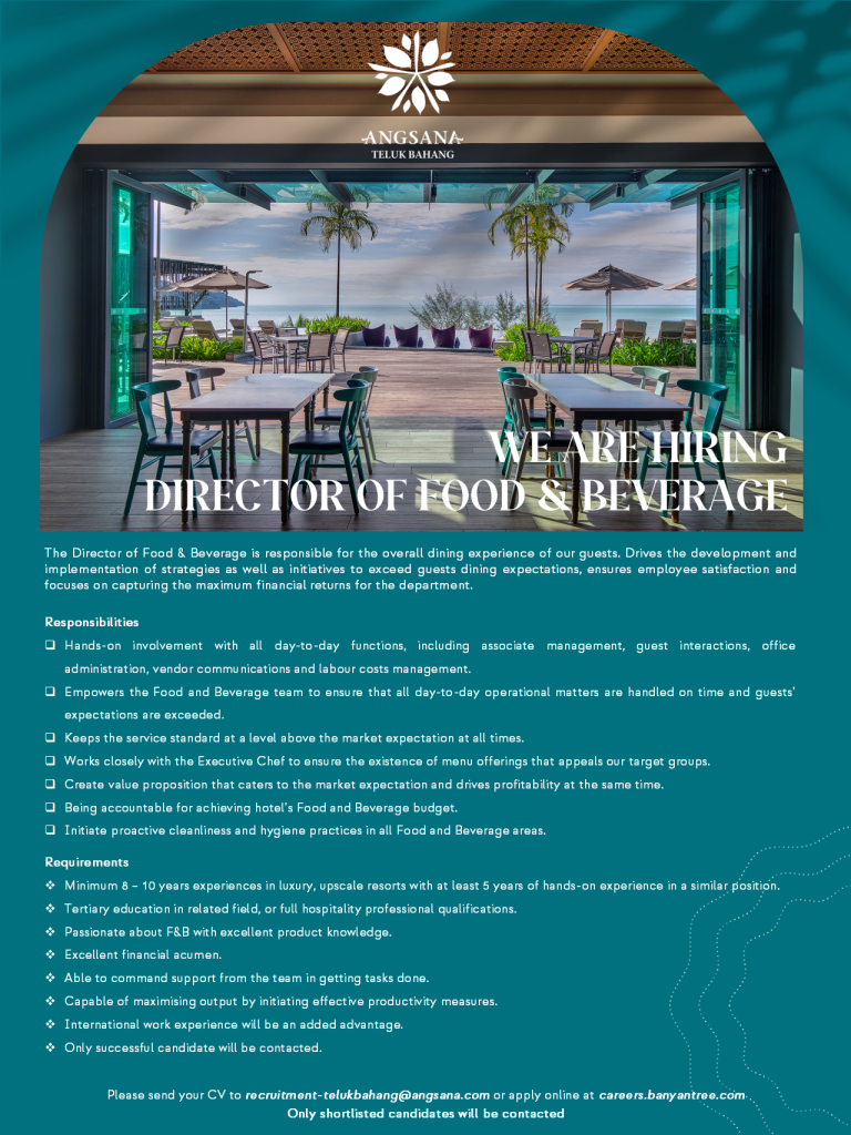 • Minimum 8 – 10 years experiences in luxury, upscale resorts with at least 5 years of hands-on experience in a similar position.
