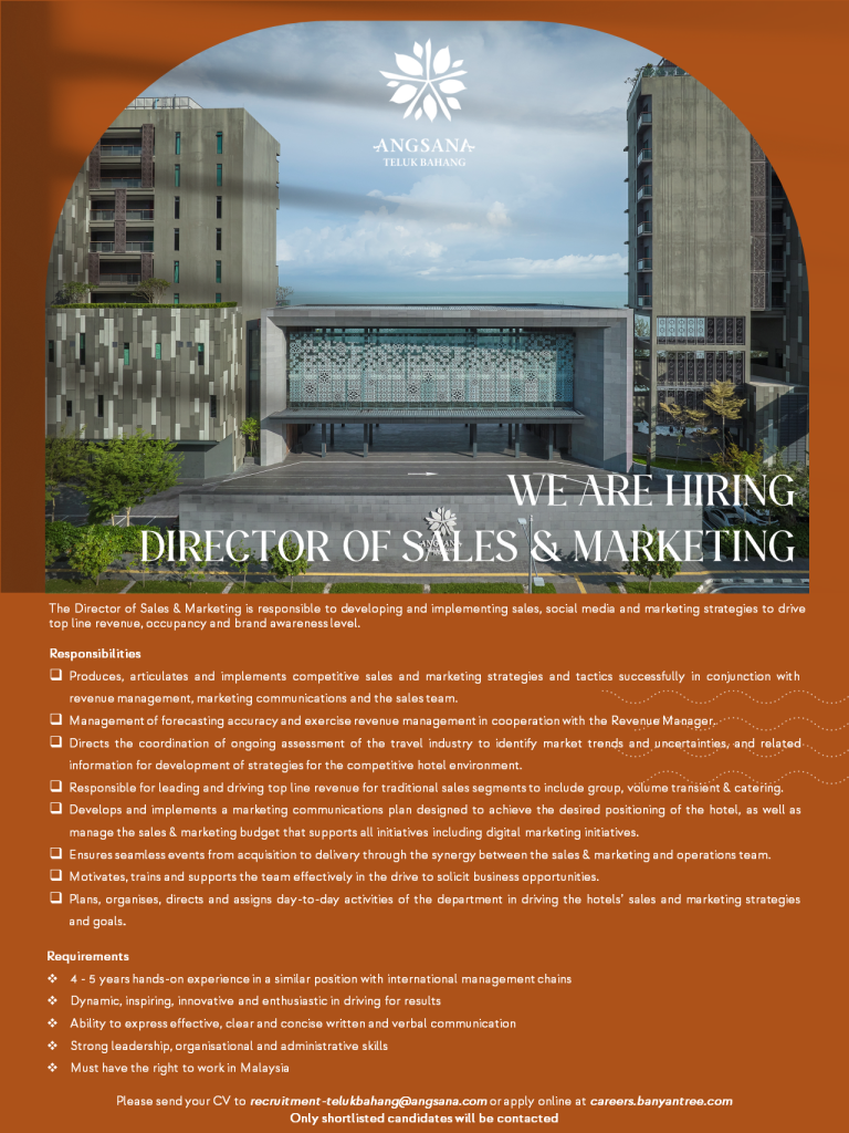 - Plans, organises, directs and assigns day-to-day activities of the department in driving the hotels’ sales and marketing strategies and goals.